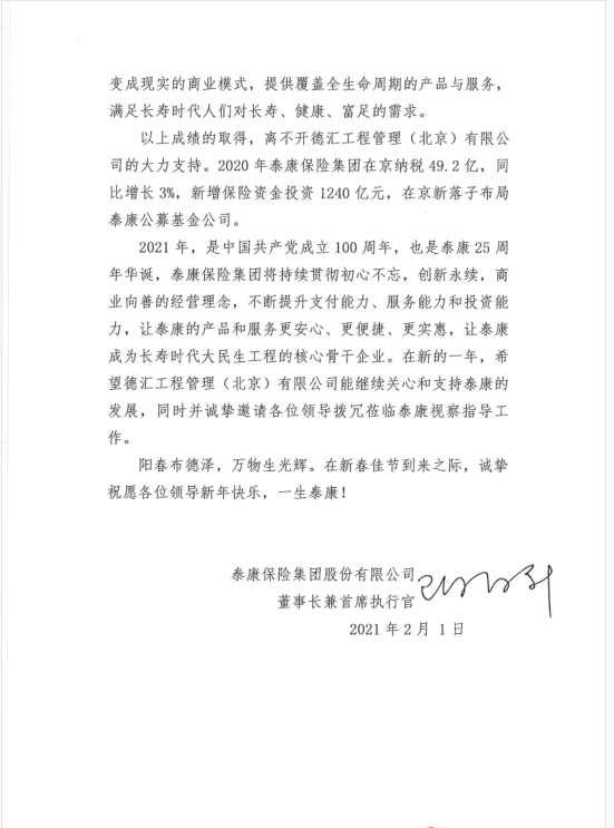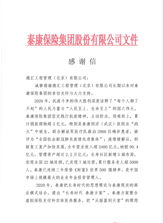 2021年新年工作伊始,公司收到了業主泰康保險集團股份有限公司發來的感謝信!