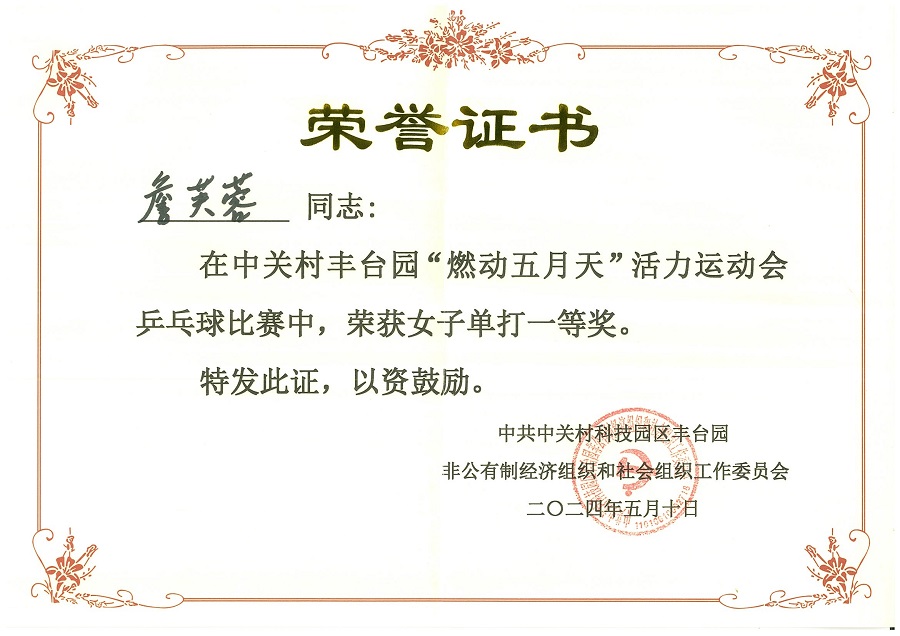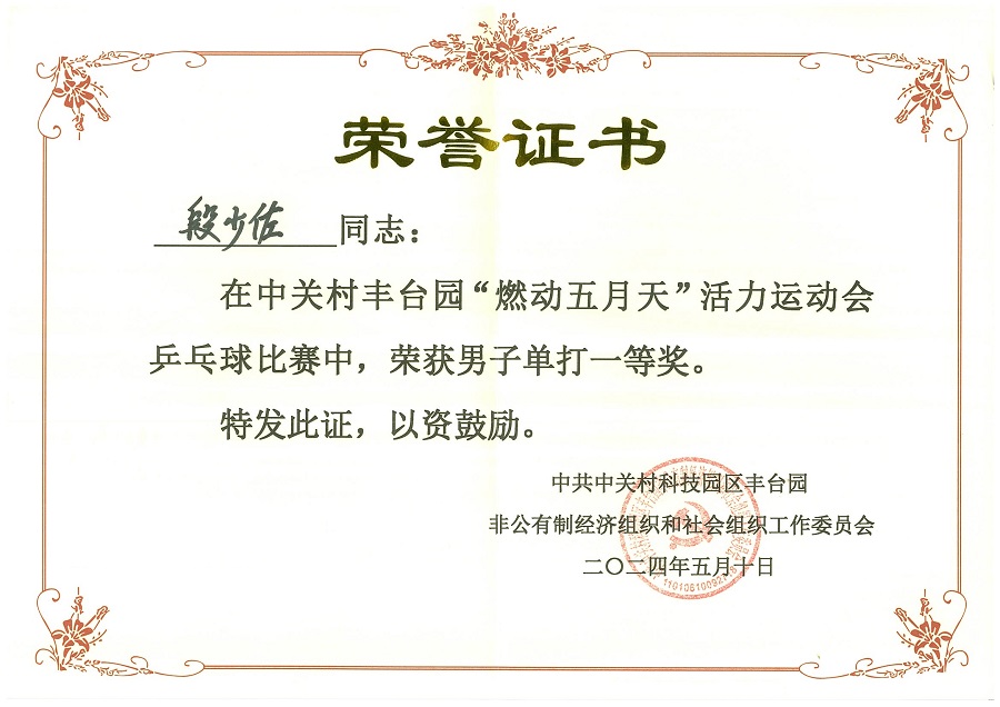 5月10日下午,在中關(guān)村豐臺(tái)園“兩新”組織舉辦的“熱血青春 乒出風(fēng)采”乒乓球友誼賽中,我司選手詹芙蓉、段少佐穩(wěn)扎穩(wěn)打,一路過關(guān)斬將,最終奪取“燃動(dòng)五月天”乒乓球女子單打和男子單打一等獎(jiǎng)的好成績(jī)。