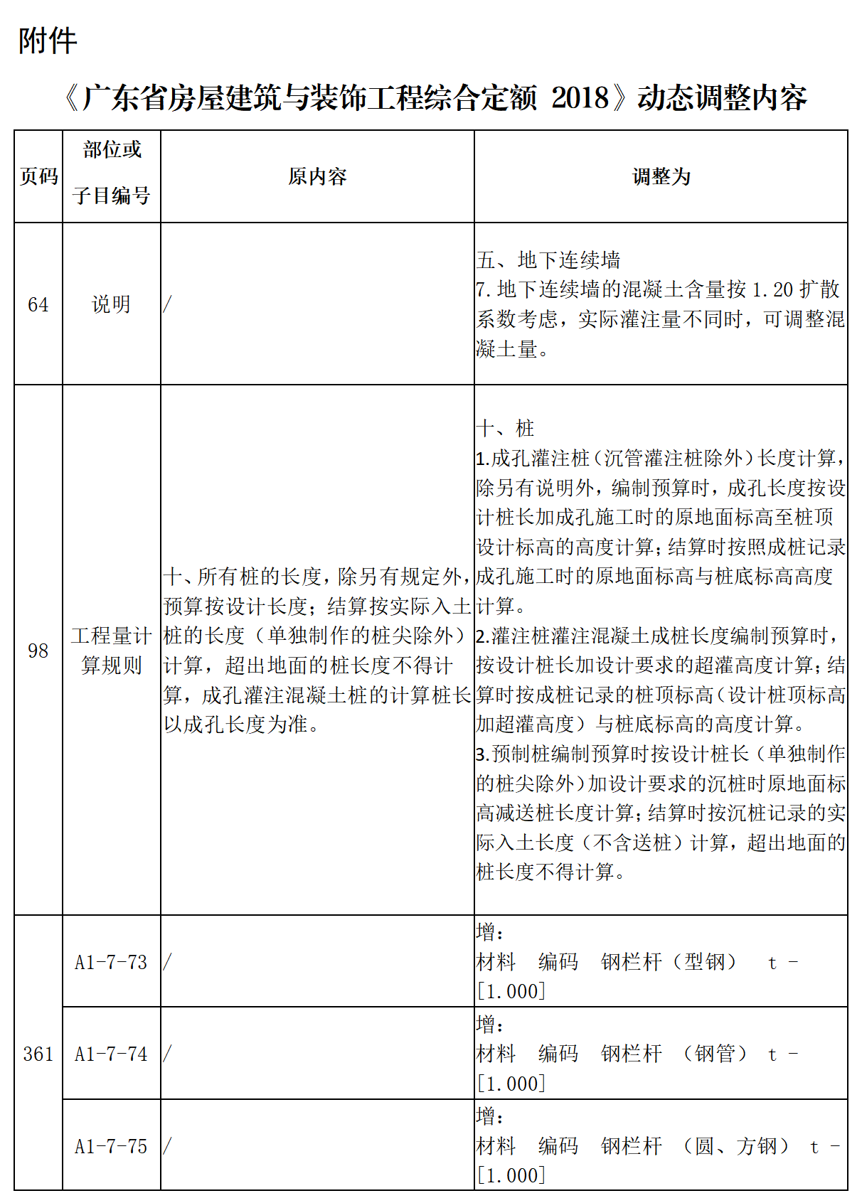 附件:《廣東省房屋建筑與裝飾工程綜合定額 2018》動態調整內容