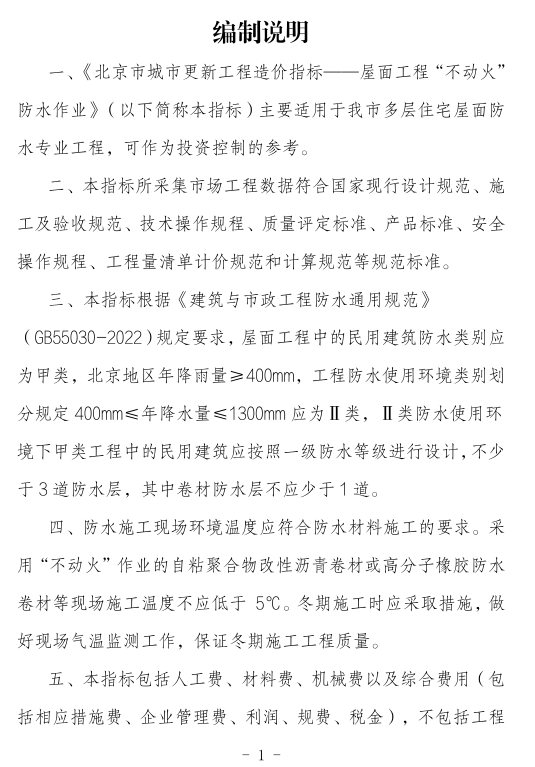北京市住房和城鄉建設委員會發布《北京市城市更新工程造價指標——屋面工程“不動火”防水作業》