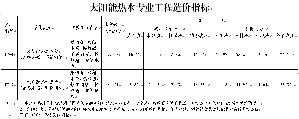 一、《太陽能熱水專業工程造價指標(修訂稿)》(以下簡稱本指標)主要適用于民用住宅的太陽能熱水專業工程,可作為投資控制和工程招標時確定專業工程暫估價的參考。