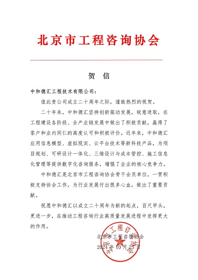 喜訊┃北京市工程咨詢協(xié)會祝賀中和德匯20周年賀信