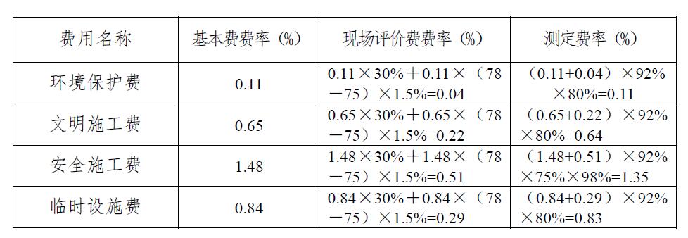 最終綜合評(píng)價(jià)得分為75~80分(不含80分)者,計(jì)取安全文明施工現(xiàn)場(chǎng)評(píng)價(jià)費(fèi),現(xiàn)場(chǎng)評(píng)價(jià)費(fèi)費(fèi)率=基本費(fèi)費(fèi)率×30%+基本費(fèi)費(fèi)率×(最終綜合評(píng)價(jià)得分-75)×1.5%。