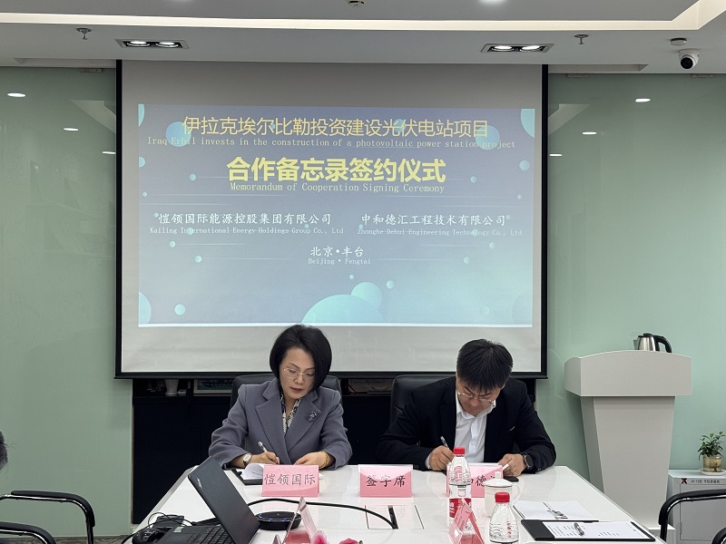 3月11日下午,愷領國際能源控股集團有限公司(以下簡稱“愷領國際”)與中和德匯工程技術有限公司(以下簡稱“中和德匯”)在北京豐臺正式完成了關于伊拉克埃爾比勒光伏電站項目的簽約儀式。