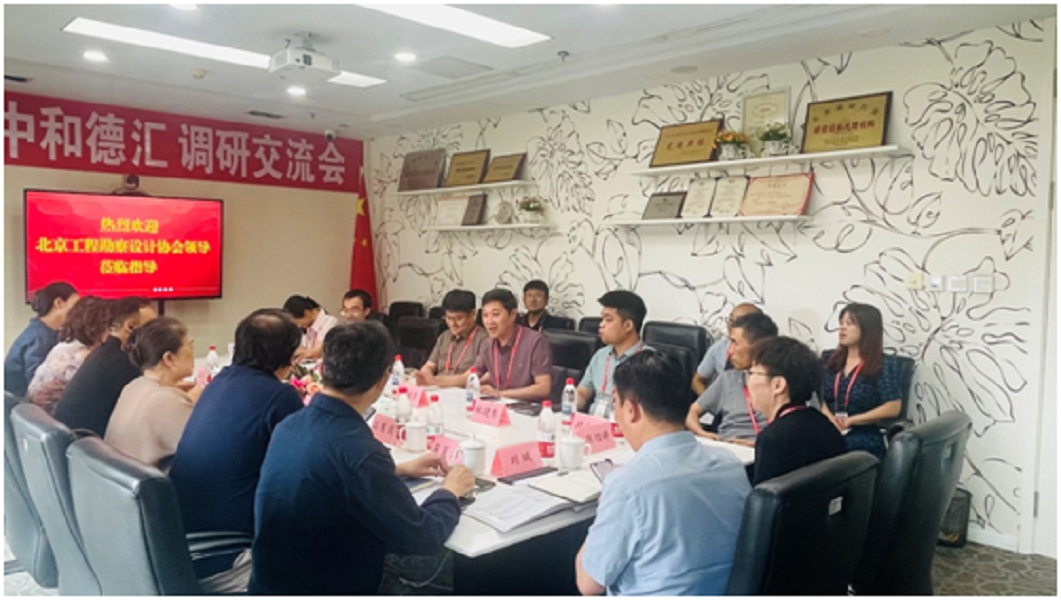 2025 年 6 月 13日,北京工程勘察設計協會秘書長胡頤蘅攜副秘書長陳可、黨支部書記兼辦公室主任徐麗、協會培訓中心校長彭惠、信息化工作委員會主任石慧崗、技術經濟工作委員會主任蔣夏濤、工程總承包分會秘書長劉斌一行到我公司調研交流。集團總裁、中和德匯公司董事長王總致歡迎詞,對胡秘書長一行蒞臨指導表示熱烈歡迎。