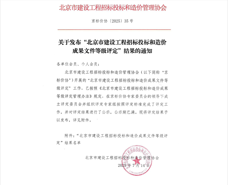 熱烈祝賀中和德匯榮獲“2025年度北京市建設工程招標投標及造價成果文件等級評定”獎項