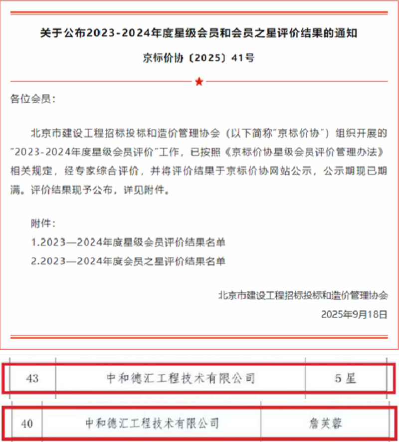 近日,北京市建設(shè)工程招標(biāo)投標(biāo)和造價(jià)管理協(xié)會(huì)正式公布2023-2024年度星級(jí)會(huì)員和會(huì)員之星評(píng)價(jià)結(jié)果,我司憑借扎實(shí)的專業(yè)能力、規(guī)范的服務(wù)流程與卓越的行業(yè)口碑,成功斬獲“5星級(jí)單位”的最高榮譽(yù)稱號(hào),我司行業(yè)專家詹芙蓉憑借多年深耕專業(yè)領(lǐng)域榮獲“會(huì)員之星”的榮譽(yù)稱號(hào)。這標(biāo)志著公司綜合實(shí)力獲得行業(yè)權(quán)威機(jī)構(gòu)的高度肯定。