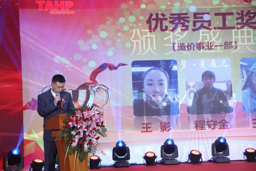本次慶典活動共分為三個部分。第一部分:主題慶典。王維東總經理和協會領導林萌先生、章玉明女士分別上臺致辭。十五年取得的成績離不開那些一路追隨、不離不棄的合作伙伴和老員工們,分公司代表江西分公司總經理趙海和公司資深員工代表造價三部主管樊微也分別上臺發言。王維東總經理在致辭中向現場來賓闡釋了德匯十五年來的發展歷程,及未來的企業規劃,表示:德匯經過十五年的不斷發展,從創業初期的舉步維艱、艱辛奮斗,走到今天已發展成為集工程咨詢、招標代理、造價咨詢、項目管理及工程監理為一體的綜合性公司,感謝各位領導、朋友、合作單位的支持以及全體員工辛勤的工作,堅信德匯未來的日子里一定會更加輝煌。5位中層管理者講述了自己與德匯的故事,感動肺腑,詹總和王總上臺為他們獻花,與他們一起共同演繹了由市場營銷部經理羅天舒精心準備的原創詩歌《仰世而來》配樂朗誦,用飽含情深且慷慨激昂的文字講述了德匯十五年來的發展歷程。活動現場還舉行了“優秀員工獎”的頒獎儀式,王影、程守金、王靜等15人得到了公司的表彰。