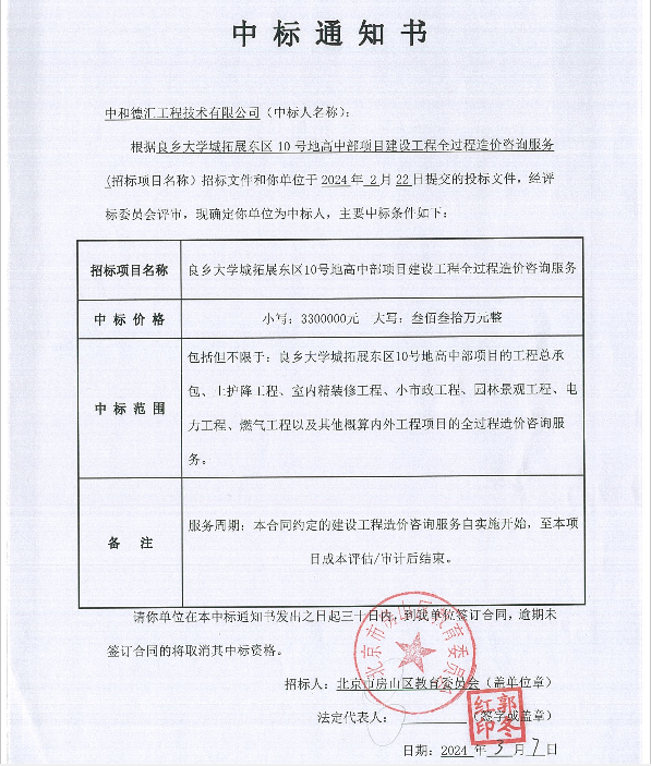 2024年3月,我司造價板塊在(良鄉大學城拓展東區10號地高中部項目)競標中,憑借扎實高效的工作作風,雄厚的技術力量和良好的企業信譽,以絕對優勢中標。